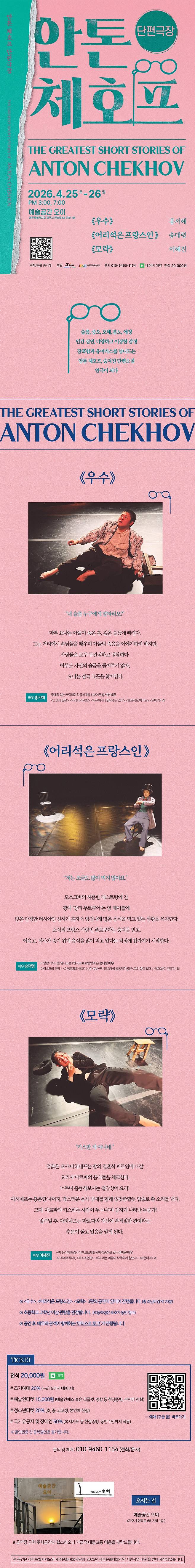 안톤 체호프는 슬픔, 증오, 분노, 애정 등 인간 심연의 다양하고도 이상한 감정을 담아낸 러시아 문학 황금시대 마지막을 장식한 거장이다. 이번 연극은 다양한 그의 작품 중 잘 알려지지 않은 단편소설 3편 <우수>, <어리석은 프랑스인>, <모략>을 연극으로 재구성했다.