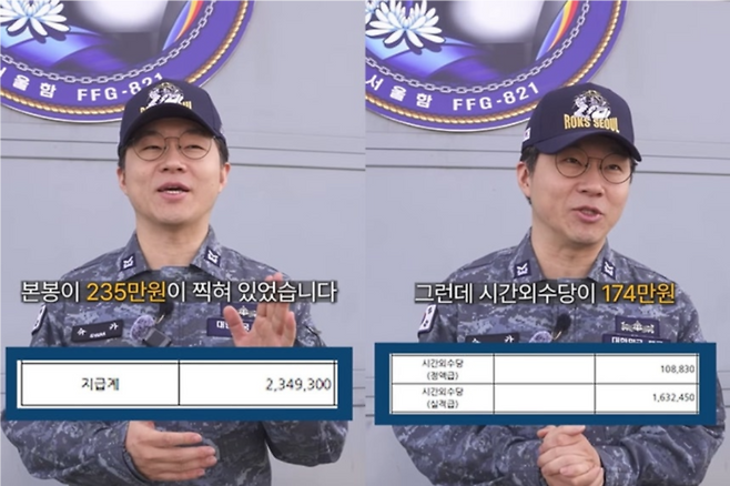 그는 "막내 하사인 2호봉의 급여 명세서를 보고 깜짝 놀랐다"며 "본봉이 235만원이 찍혀 있었는데, 시간외수당 174만원과 함정근무수당 31만원이 더해져 총 210만원의 수당이 붙었다"고 말했다.