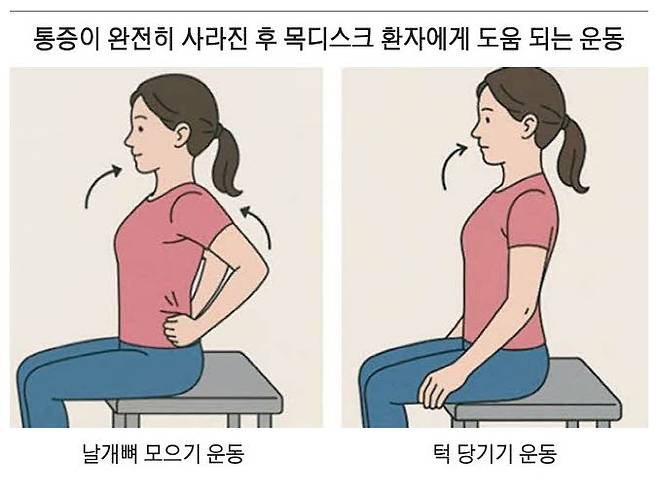 통증이 완전히 사라진 후(아급성기)부터 목디스크 환자에게 도움이 되는 운동은 '턱 당기기'나 '날개뼈 모으기' 같은 스트레칭이다. 턱 당기기는 턱을 살짝 당겨 이중 턱을 만드는 느낌으로 지그시 누르는 운동이다. 날개뼈 모으기는 가슴을 펴고, 어깨를 뒤로 살짝 젖히면서 양쪽 날개뼈를 서로 모아주면 된다. 5~10초씩 10회 반복하면 효과적이다. 목과 허리를 뒤로 젖히는 '맥켄지 신전운동'은 목디스크 환자의 통증을 악화할 우려가 있어 권장하지 않는다.