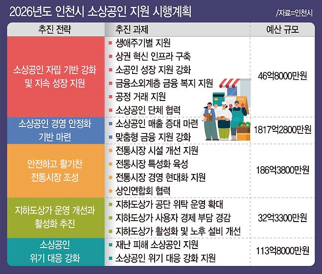 '2026년도 인천시 소상공인 지원 시행계획'을 보면 시는 올해 2196억원 규모 예산을 투입해 5대 전략별로 17개 과제를 추진한다. 시 관계자는 "경기 둔화와 소비 회복 지연 등으로 어려움을 겪는 소상공인을 지역 경제 성장 주체로 전환하는 데 초점을 맞춘 것이 특징"이라며 설명했다.