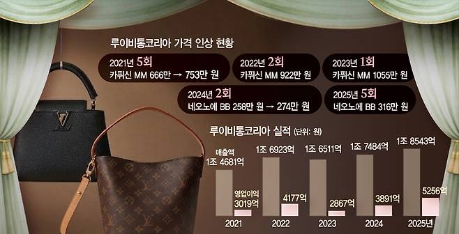 루이비통은 코로나19 팬데믹 시기 보복소비로 명품 수요가 급증하자 2021년 한해에만 5차례 집중적으로 가격을 올렸다. 이어 2022년(2회), 2023년(1회), 2024년(2회, 지난해(5회) 등 가격을 지속적으로 인상했다. 해당 기간 대표 제품 ‘카퓌신 MM’은 600만 원대에서 1000만 원대로 껑충 뛰었다. 루이비통의 매출액도 2019년 7846억 원에서 지난해 1조 8543억 원으로 급증했다. 같은 기간 영업이익은 549억 원에서 5256억 원으로 뛰었다.