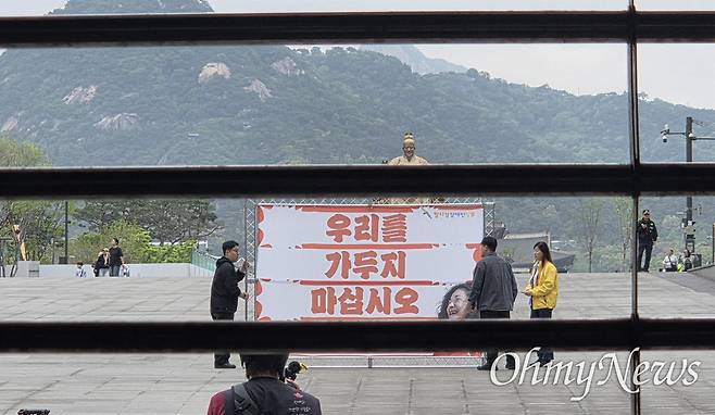 지하철 환승을 거쳐 1시간 10분 만에 광화문 해치마당에 도착했다. 조 예비후보를 향해 활동가들이 몰렸다. 일명 '목소리 보좌관'인 박동녘(34)씨와 서한영교(44)씨는 조 예비후보와 마이크 색깔부터 볼륨까지 신중하게 고민했다. 두 사람은 AAC 연설문 음성을 제작했다.