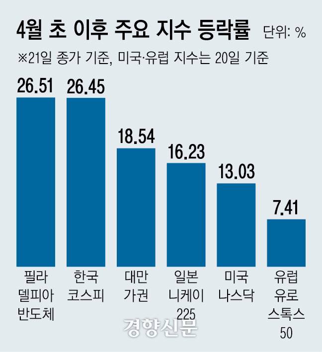 특히 한국 증시는 반도체 의존도가 높고 실적 전망이 상향 조정되고 있어 상승세가 더 가파르다. 전쟁에도 지난달 수출이 반도체를 중심으로 역대 처음으로 800억달러를 넘기는 등 반도체 수요 증가세가 확인되고 삼성전자도 호실적을 발표하면서 삼성전자·SK하이닉스와 코스피의 올해 이익 전망이 큰 폭으로 올랐다. 이달 삼성전자는 30.98%, SK하이닉스는 51.67% 급등하면서 지수를 끌어올리고 있다.