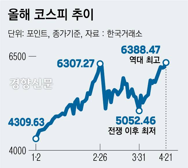 이날 코스피는 전날보다 169.38포인트(2.72%) 오른 6388.47에 거래를 마쳤다. 전쟁 이전인 지난 2월말 기록한 역대 장중·종가 최고가를 두달 만에 경신했다. 시가총액도 5236조원으로 사상 최대치를 기록했다.