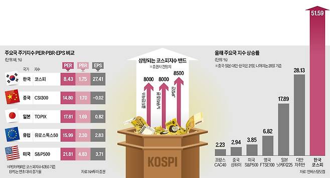 정부의 주식시장 활성화 정책과 모건스탠리캐피털인터내셔널(MSCI)선진국지수 편입 등도 증시 호재가 됐다. 최근 글로벌 투자은행(IB) 골드만삭스가 코스피의 향후 12개월 목표치를 기존 7000포인트에서 8000포인트로 상향했다.