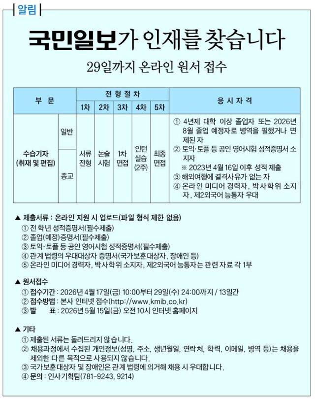 국민일보는 강자에게 엄정하고 약자에게 따뜻한 언론입니다. 지적장애를 가진 피해자가 사기로 전 재산을 잃고도 수사기관의 불송치 결정 앞에 고립됐을 때 우리는 그 기록을 다시 펼쳤습니다. 약자의 억울함을 기록하는 일은 강자의 범죄를 밝히는 것만큼 가치 있다고 믿기 때문입니다. 국민일보에 오시면 강자와 약자의 이야기를 균형 있게 다룰 수 있습니다. 사서 고생할 동료를 기다립니다.