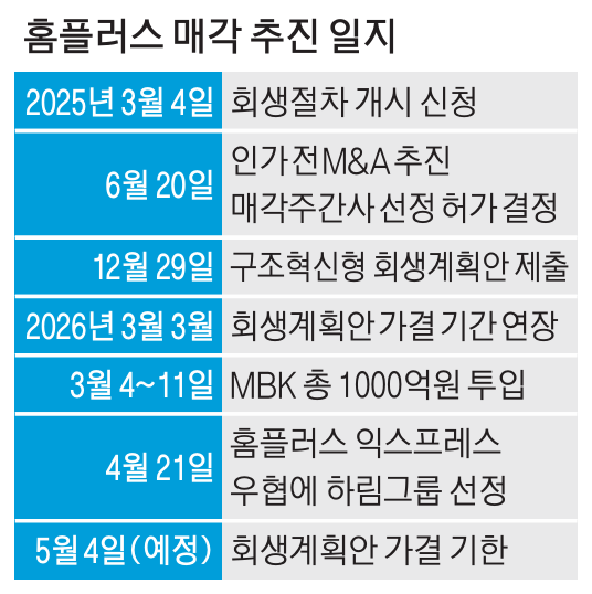 매각 측은 결국 홈플러스 익스프레스를 분리매각 하는 방안을 골자로 하는 구조혁신형 회생계획안을 지난해 말 서울회생법원에 제출했다. 예비입찰에 메가MGC커피를 운영하는 엠지씨글로벌 등이 참여했으나 시장에서는 보유 현금에 대한 우려를 나타냈다. 결국 본입찰에 하림그룹이 참전하면서 홈플러스 회생은 첫 발을 떼게 됐다.