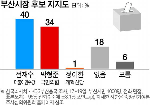 21일 국제신문 취재를 종합하면 박 시장 측은 전날 공개된 한국리서치·KBS부산총국 조사(17~19일, 부산시민 1000명, 전화 면접, 표본오차는 95% 신뢰수준에 ±3.1% 포인트(p), 자세한 사항은 중앙선거여론조사심의위원회 참조)에 고무된 분위기다. 박 시장은 34%의 지지율로 전 의원(40%)과 오차범위 내였다. 올해 초부터 발표된 여론조사에서 박 시장은 전 의원에게 10%포인트 이상의 격차로 밀렸는데, 양자 간 지지율 격차가 오차범위 내에 들어온 것은 처음이다.