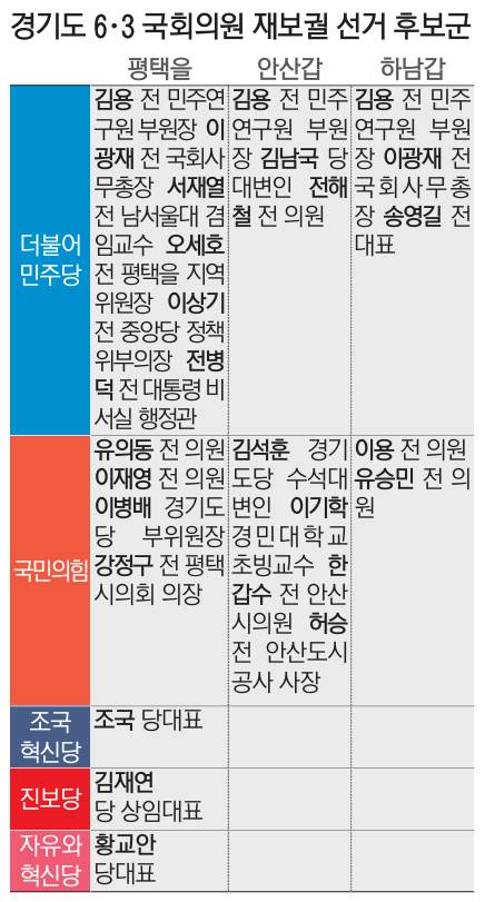 도내에선 평택을·안산갑·하남갑 등 모두 3곳에서 재보선이 진행되는데, 더불어민주당에선 김용 전 민주연구원 부원장과 이광재 전 국회사무총장이 복수의 지역에서 후보로 거론된다.