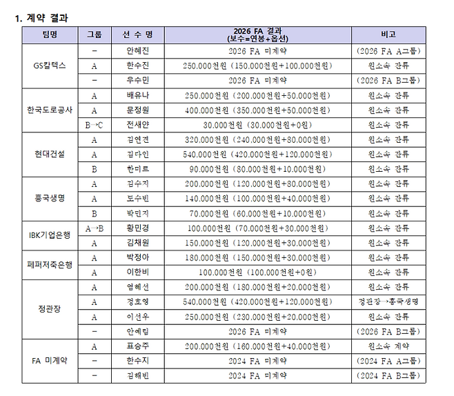 2025~26시즌 한국도로공사의 정규리그 우승을 이끈 베테랑 배유나는 2억5000만원에 잔류했고, 역시 한국도로공사 아이콘인 문정원도 4억원에 잔류했다. 국가대표로 뛰었던 김수지도 흥국생명과 2억원에 1년 더 동행하기로 했고, 지난 시즌 FA 미아로 남아 방송 활동에 주력했던 표승주는 정관장과 계약한 뒤 드래프트 지명권 교환이 포함된 트레이드로 흥국생명 유니폼을 입었다.