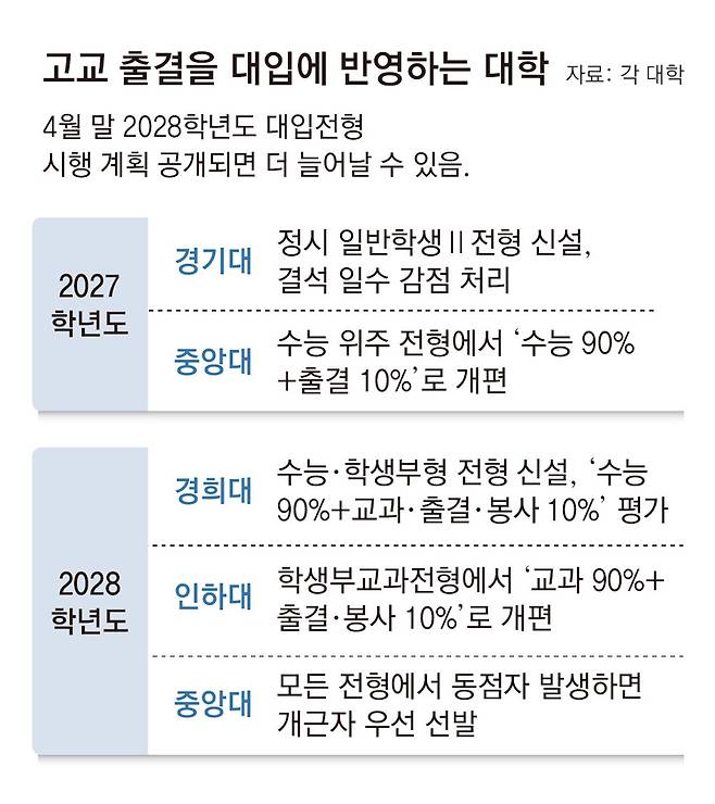 현재 고2가 치를 2028학년도 대입에서는 출결을 반영하는 대학이 더 늘어난다. 대학들은 이달 말까지 2028학년도 대입전형 시행계획을 공개하는데, 이미 출결을 반영하겠다고 밝힌 곳이 상당수다. 중앙대는 2028학년도부터 모든 전형에서 동점자가 발생하면 개근 학생을 우선 선발할 방침이다. 경희대는 2028학년도 정시에서 수능·학생부형 전형을 신설하고 수능 성적 90%와 학생부 교과, 출결, 봉사를 10% 반영한다.