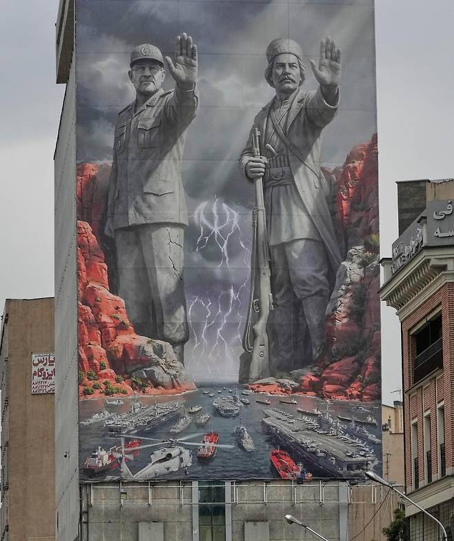 | 호르무즈 막아선 이란의 ‘두 영웅’ 호르무즈 해협 봉쇄를 둘러싼 미국과 이란의 힘겨루기가 이어지는 가운데, 20일(현지 시간) 이란 수도 테헤란 시내 건물에 두 명의 이란 ‘전쟁 영웅’이 호르무즈를 막아선 모습을 묘사한 대형 현수막이 걸렸다. 왼쪽은 호르무즈 해협 통제 작전을 지휘하다가 지난달 26일 이스라엘 공습으로 사망한 알리레자 탕시리 이란 혁명수비대 해군사령관이고, 오른쪽은 1900년대 초 영국군에 맞서 싸운 민족 영웅 라이스알리 델바리다. 테헤란=AP 뉴시스 |