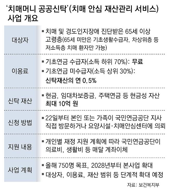 보건복지부와 국민연금공단은 22일부터 ‘치매 안심 재산관리 서비스’ 시범 사업을 시작한다고 21일 밝혔다. 공단이 치매나 치매 전 단계인 경도인지장애를 앓는 고령자와 신탁 계약을 맺고 최대 10억 원의 현금성 자산을 관리해 주는 서비스다. 치매머니 공공신탁에 대한 궁금증을 문답 형식으로 정리했다.