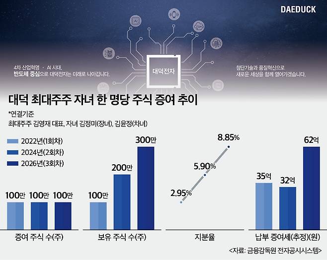 업계에선 김 대표가 경영권 승계를 위한 포석으로 두 딸의 기업 지분율을 앞으로도 꾸준히 늘릴 거란 분석이 나온다. 두 자녀 모두 30대 중반으로, 그중 장녀 김정미는 현재 대덕전자에서 근무하며 회사 내부 현안을 살피고 있는 것으로 알려진다. 차녀 김윤정은 아직 대덕 계열사에 재직 전이다. 다만 대덕 지분율은 장녀와 동일하게 높아지고 있어, 향후 동등하게 경영권 인수인계를 받을 것으로 전망된다.