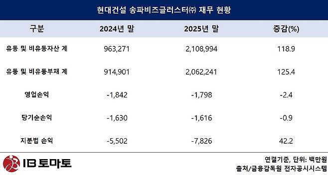 물론 현재 수익성 측면에서는 아직 초기 단계인 만큼 본격적인 성과가 나타나지 않고 있다. 송파비즈클러스터㈜는 지난해 기준 영업손실 18억원, 당기순손실 16억원을 기록하며 전년과 유사한 수준의 적자를 이어갔으며, 지분법 손실 역시 55억원에서 78억원으로 확대됐다. 이는 사업 초기 단계에서 토지비와 금융비용 등 선투입 비용이 먼저 반영되는 방식에 따른 것으로, 매출 발생 이전의 비용이 누적된 영향이다. 업계에서는 본격적인 수익 인식은 임대 안정화나 자산 매각이 이뤄지는 준공 이후 단계에서 가능할 것으로 보고 있다.