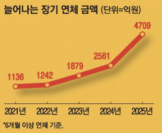 특히 증가 속도도 갈수록 가팔라지는 추세다. 2021년까지만 해도 6개월 이상 연체액 증가율은 9.4%로 한 자릿수 증가에 그쳤지만, 이후 연간 증가율이 급등하면서 지난해에는 전년 대비 80%를 웃도는 급증세를 기록했다.