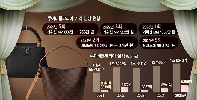 루이비통은 코로나19 팬데믹 시기 보복소비로 명품 수요가 급증하자 2021년 한 해에만 5차례 가격을 올렸다. 이어 2022년 2차례, 2023년 1차례, 2024년 2차례, 지난해 5차례 가격 인상을 이어갔다. 대표 제품인 ‘카퓌신 MM’은 해당 기간 600만 원대에서 1000만 원대로 뛰었다. 그 결과 루이비통코리아의 매출은 2019년 7846억 원에서 지난해 1조 8543억 원으로 늘었고, 같은 기간 영업이익은 549억 원에서 5256억 원으로 뛰었다.