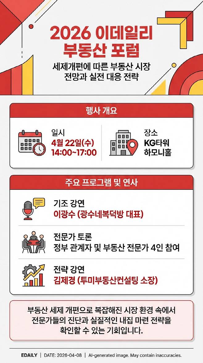 이날 행사에는 이광수 광수네복덕방 대표가 부동산 세제개편에 따른 시장 전망을 주제로 기조 강연을 진행한다. 이후 이정훈 이데일리 논설실장을 좌장으로 장우철 국토교통부 주택정책관, 이광수 대표, 심형석 법무법인 조율 수석전문위원 겸 미국 IAU 교수, 박원갑 KB국민은행 수석전문위원간 토론이 이어진다.