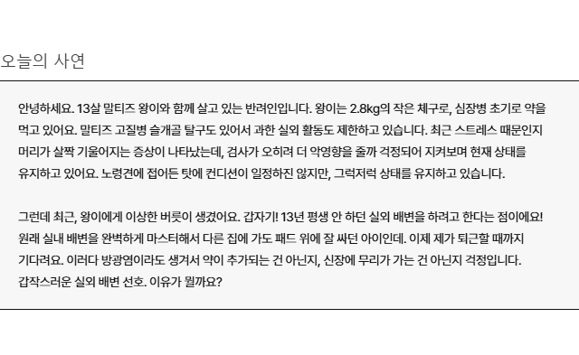 노령견과의 삶은 조금 다른 기준이 필요해집니다. 기존의 루틴에 맞추게 하는 것이 아니라 반려견에게 맞춰주는 방향으로요. 왕이는 지금 버릇이 생긴 것이 아니라 나이가 들며 자연스럽게 변화를 겪고 있는 과정에 있습니다. 예전에는 완벽하게 실내 배변을 하던 왕이였지만, 지금은 실외에서 더 편안함을 느끼고 있는 상태일 수 있습니다. 또한 앞으로도 배변 습관, 수면 패턴 변화, 반응 속도 등 여러 변화가 이어질 수 있습니다. 그 변화를 이해하고, 그 안에서 아이가 편안하게 지낼 수 있도록 도와주는 것. 그것만으로도 보호자님은 이미 충분히 잘하고 계십니다. 앞으로의 시간 속에서 왕이가 더 이상 참지 않고, 급하지도 않게, 자신의 방식대로 편안한 하루를 보내기를 바랍니다.
