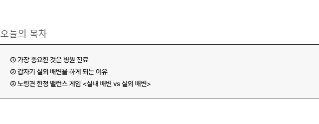 노령견이라면 보호자의 편의나 교육보다 반려견의 선택이 우선입니다. 성견이라면 교육이나 트레이닝으로 조정할 수 있지만, 노령견은 학습이 더디거나 어렵기 때문에 적응과 편안함이 더 중요해집니다. 특히 지금처럼 배변을 참고 기다리는 경우라면 그 자체가 건강 리스크가 될 수 있습니다. 배변을 오래 참으면 방광염과 같은 요로 질환으로 이어질 가능성이 있고, 노화가 진행될수록 괄약근 기능이 약해지면서 배변 실수가 늘어날 수 있어요. 따라서 중요한 것은 정답을 정하는 것이 아니라 선택지를 늘리는 것입니다.