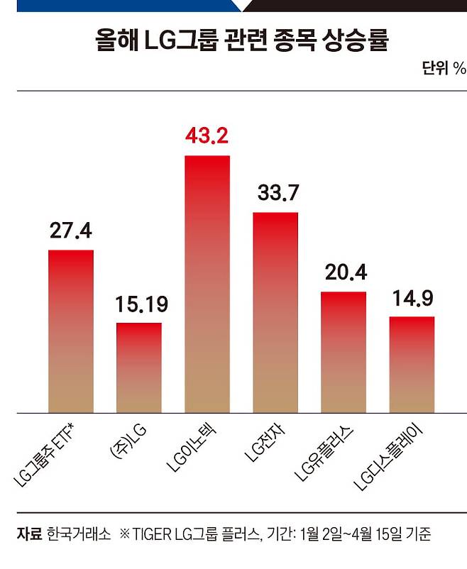 이 같은 변화는 주가에도 반영되고 있다. LG그룹 ETF인 ‘TIGER LG그룹 플러스’는 연초 대비 27% 넘게 상승했다. LG이노텍(43.2%), LG전자(33.7%)를 중심으로 주요 계열사 주가가 일제히 오르면서 영향을 받았다.