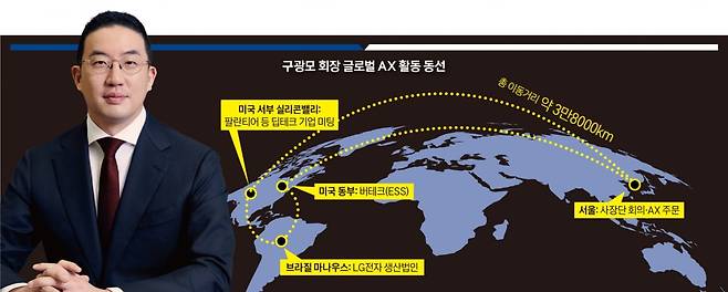 지난 3월 말 구 회장은 서울에서 출발해 미국 동부에 위치한 LG에너지솔루션의 ESS 자회사 버테크(Vertech)를 거쳐 지구 반대편 브라질 마나우스에 위치한 LG전자 생산법인을 찍고 팔란티어 등 딥테크 기업 수장과의 만남을 위해 다시 미국 서부 실리콘밸리를 찾았다.