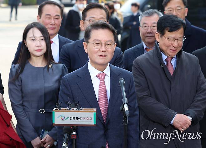 | ▲ 윤석열 대통령의 탄핵심판 선고일인 지난 2025년 4월 3일 서울 종로구 헌법재판소에서 윤 대통령 측 대리인단 윤갑근 변호사가 심판정으로 들어서기 앞서 발언하고 있다. |