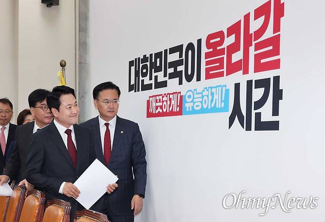 | ▲ 장동혁 국민의힘 대표가 지난 20일 서울 여의도 국회에서 열린 최고위원회의에 입장하며 회의장에 내걸린 백보드를 바라보고 있다. |