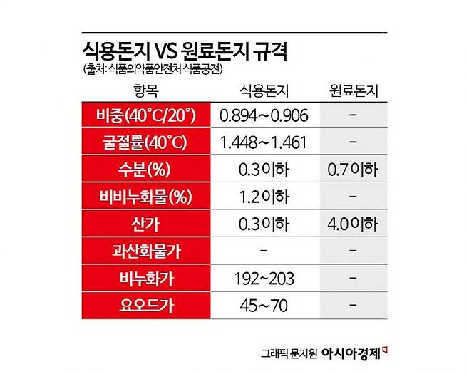 식약처 관계자는 "정제되지 않은 원료돈지는 식용으로 적절하지 않다"며 "원료돈지를 식용돈지처럼 유통한 사실이 확인되면 현행법상 기준 규격 위반으로 조치를 취할 수 있다"고 말했다.