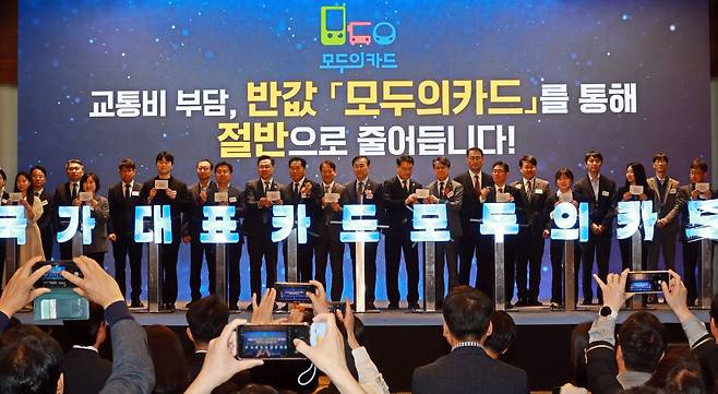 | ▲ 김윤덕 국토교통부 장관, 진성준 국회 예결위원장, 김용석 국토교통부 대도시권광역교통위원장 등 내빈들이 14일 서울 중구 포스트타워에서 열린 '모두의카드' 이용자 500만명 기념식에서 기념 세리머니를 하고 있다. |