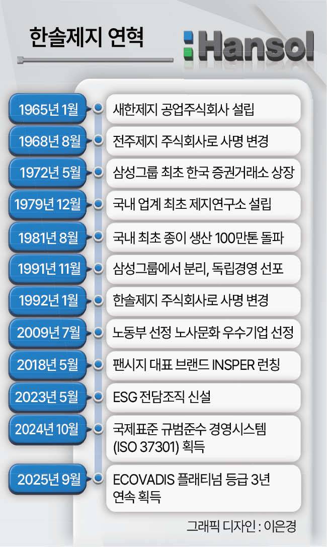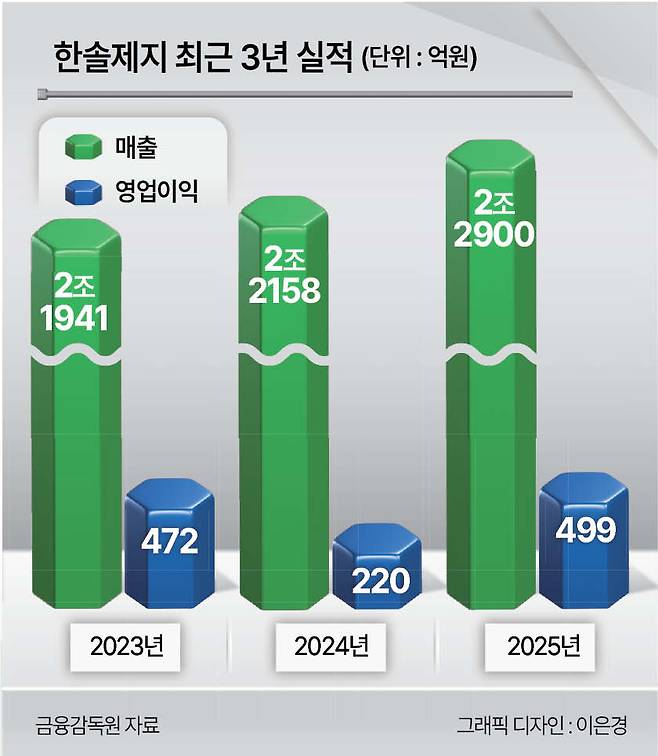 숫자로 본 성과는 더 구체적이다. 한솔제지의 재활용 원료 사용 비율은 2023년 46%에서 2024년 49%로 상승했다. 만드는 종이의 절반 가까이가 새 펄프가 아닌 재활용 원료에서 나온다는 뜻이다. FSC Recycled 등 친환경 인증을 획득한 제품들의 매출액도 2023년 4663억원에서 2024년 4991억원으로 7% 늘었다. 친환경이라는 방향성이 단순한 구호가 아니라 실질적인 매출 성장으로 이어지고 있다.
