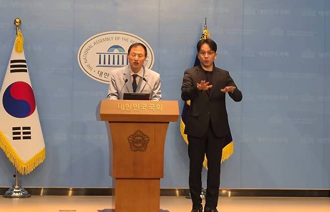 | ▲ 김상욱 의원이 22일 국회 소통관에서 송영길 전 대표에 대한 합당한 대우를 요구하는 기자회견을 하고 있다. |