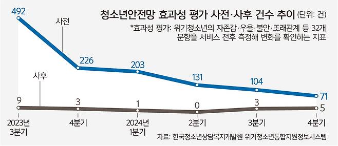 안전망팀이 사라진 뒤 위기청소년을 지원하는 청소년 안전망은 제 기능을 하지 못하고 있다. 실제로 취재팀이 확보한 위기청소년통합지원정보시스템 데이터에 따르면 효과성 사전·사후 평가 건수는 2023년 3분기 492건·9건에서 이듬해 1분기 203건·1건, 2분기 131건·0건으로 급감했다.