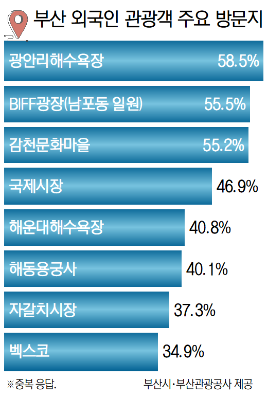 부산시·부산관광공사가 발표한 ‘부산 방문 관광객 실태조사’에 따르면 2024년 외국인 관광객 주요 방문지 비율은 광안리 해수욕장이 58.5%로 가장 높았으며, 그다음으로 BIFF광장(55.5%), 감천문화마을(55.2%) 등의 순이다. 20대는 BIFF광장 방문율이 가장 높게 나타났으며 30~40대는 광안리 해수욕장, 50대는 해동용궁사와 벡스코를 주로 찾았다. 특정 국가에서 유독 인기가 많은 관광지도 있었는데, 광안리 해수욕장은 미국 방문객(64.1%)에게, 자갈치시장은 중국 방문객(44.3%)에게 상대적으로 인기가 높았다.