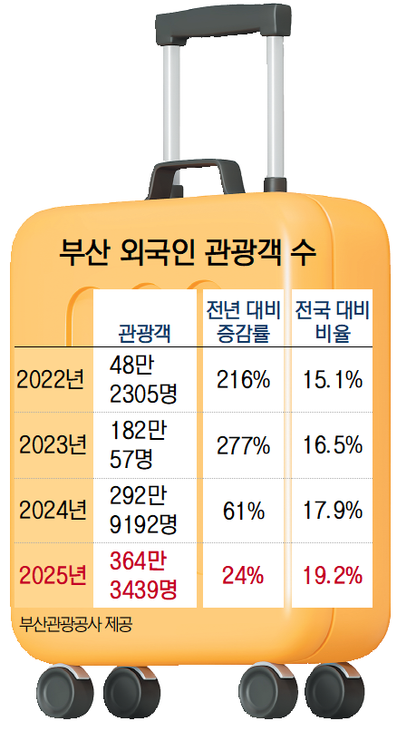 글로벌 관광지로서의 위상은 덩달아 높아졌다. 부산은 해외여행 플랫폼 ‘트립질라’에서 ‘2025년 최고의 도시 관광 목적지’로 선정됐다. 중국 알리바바그룹 여행 플랫폼인 ‘플리기(Fliggy)’에서는 ‘2024년 젊은 층에 가장 인기 있는 관광지’로 꼽히는 등 국제적 인지도가 확대되고 있다.
