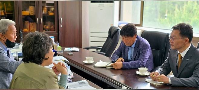 | ▲ 더불어민주당 김중남 강릉시장 후보가 22일 오전 강릉영동대학교를 방문해 현인숙 명예총장 등 대학 관계자들과 지역 대학 발전 및 인재 양성 협력을 위한 간담회를 하고 있다. |