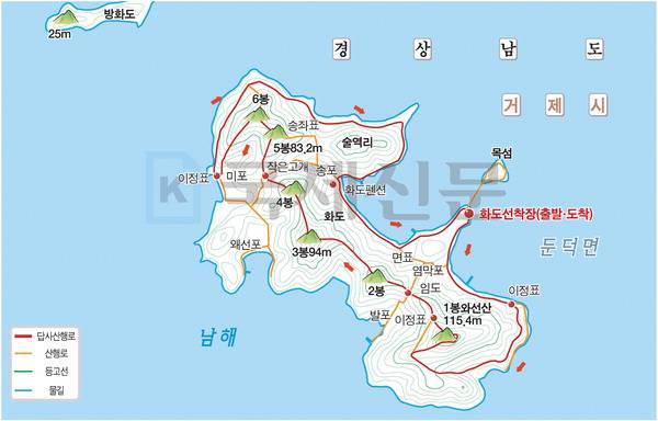 근교산 취재팀은 경남 섬 누리길 트레킹 명소로 지정된 8개 섬에서 거제 화도를 제외하면, 모두 국제신문 근교산&그너머 지면에 등산 또는 트레킹 코스로 한 번씩 알렸다. 해서 이번에는 아직 못 가봤던, 한려해상국립공원에 속한 둔덕면의 화도를 찾았다. ‘붉다’를 뜻하는 ‘붉섬’으로도 불리는 화도는 거제도 본섬의 호곡항에서 약 1.5㎞ 떨어졌으며, 면적은 1.02㎢이고, 해안선 길이가 7.2㎞ 되는 그리 크지 않은 섬이다.