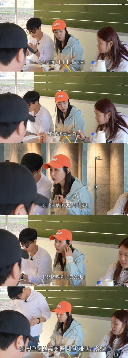 생면부지의 사람들과 함께 씻어야 했던 갑작스러운 상황에 대해 신지는 "멘탈이 나갔다"라고 덧붙이며 당시의 참담했던 심경을 전했다.