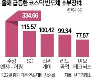 22일 한국거래소에 따르면 코스닥150정보기술지수는 올 들어 73.26% 급등했다. 거래소가 산출하는 39개 업종 지수 가운데 상승률 3위에 올랐다. 주요 구성 종목인 리노공업이 올해 99.34% 뛰었다. 리노공업은 반도체 검사용 소켓을 제작하고 있다. 주요 고객사가 2나노미터(㎚·1㎚=10억분의 1m) 공정을 적용한 애플리케이션프로세서(AP)를 도입하면서 소켓 판매 가격 상승 효과를 볼 것으로 전망된다. 반도체 증착장비 기업 주성엔지니어링(334.66%)을 비롯해 후공정 부품 제조사 ISC(115.57%), 식각 장비기업 티씨케이(100.42%) 등이 같은 기간 고공행진했다. 소부장주 강세로 코스닥에서 전기·전자 업종의 시가총액 비중이 21%를 돌파했다.
