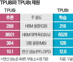 구글이 이날 발표한 TPU8t와 TPU8i는 구글이 자체 설계한 TPU의 8세대 모델이다. AI 모델을 구축하는 과정인 학습(training)과 AI 모델이 연산을 실행하는 추론(inference)의 앞 글자를 땄다. 전작들은 학습과 추론 겸용이었다.