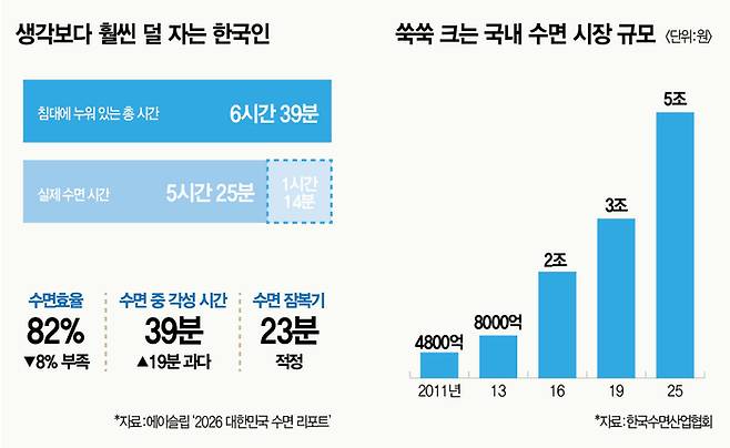 2030세대가 슬리포노믹스 주요 소비층으로 떠오른 배경에는 만성적인 수면 부족이 있다. 한국은 ‘만성피로 사회’로 불릴 만큼 전반적인 피로도가 높다. 슬립테크 기업 에이슬립이 발표한 ‘2026 대한민국 수면 리포트’에 따르면 한국인의 평균 수면 시간은 5시간 25분이다. 경제협력개발기구(OECD) 회원국 평균 수면 시간은 2021년 기준 8시간 27분으로, 격차가 크다. 2030세대 평일 평균 수면 시간도 5.9시간에 그친다.