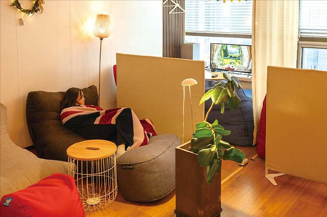 입구에 들어서자 가장 먼저 느껴지는 건 편안한 음악이다. 카페 특유의 소음 대신 낮은 조도의 조명과 잔잔한 음악이 공간을 채운다. 점심시간을 이용해 잠을 보충하려는 이용객을 위한 배려다.