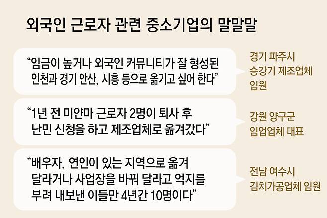 하지만 산업 현장에서는 외국인 근로자의 이직 문턱이 낮아지면 바로 인력 유출로 이어질 것이라는 우려가 많다. 파주 승강기 제조업체 임원은 “지금도 돈을 조금이라도 더 받거나 인천이나 경기 안산, 시흥시처럼 외국인 커뮤니티가 잘 형성된 지역으로 가고 싶어 한다”며 “이동 제한이 풀리면 이런 분위기가 더 강해질 것”이라고 했다.