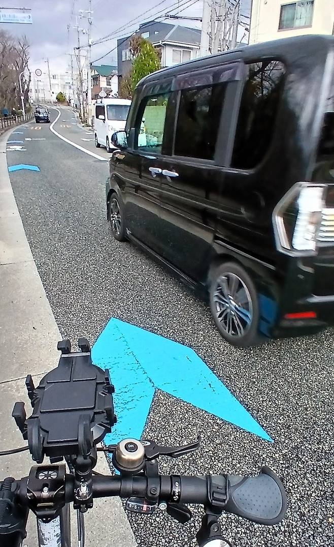 | ▲ 일본이 자전거 문화가 발달했다지만 도로 사정이 그리 좋은 것은 아니다. 몇 달간 여러 도시를 돌아다녀봤지만 자전거 전용도로는 찾아보기 어려웠고, 자전거는 인도와 차도 사이를 오가는 경우가 많았다. 사진과 같이 간혹 차도의 갓길 쪽으로 파란색으로 자전거 도로 표시가 되어 있는 것이 전부였다. |