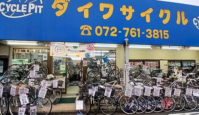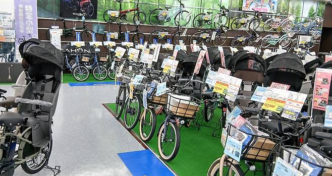 | ▲ 오사카의 한 자전거 가게에 자전거가 전시되어 있다. 일본에서는 마마차리(엄마를 뜻하는 ‘마마’와 자전거를 뜻하는 ‘차리’의 합성어)로 불리는, 앞뒤로 어린이 시트나 짐받이가 장착되어 있는 자전거를 흔히 볼 수 있다. |