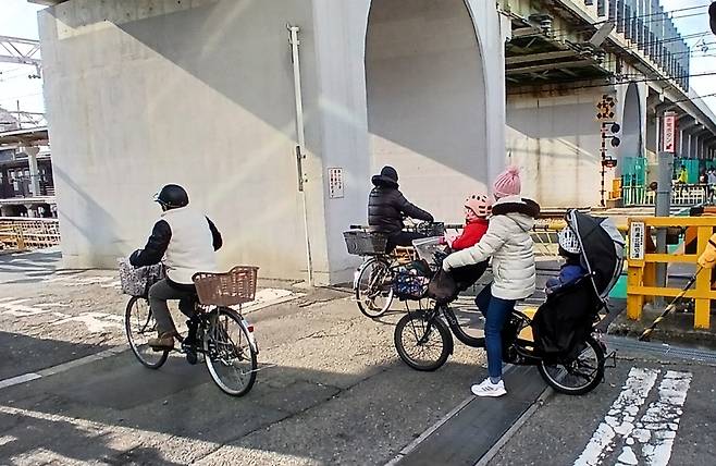 | ▲ 일본 오사카 시내에서 한 여성이 자전거 앞 뒤에 아이를 태우고 철도 건널목을 건너고 있다. |