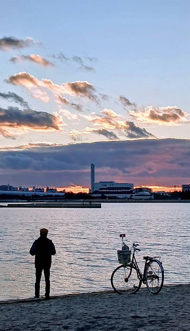 | ▲ 일본 효고현의 오마에하마 공원에서 자전거를 타고 온 남성이 저물녘 바닷가에서 노래를 부르고 있다. 일본은 도심을 벗어나면 자전거를 즐길 수 있는 곳이 많다. |