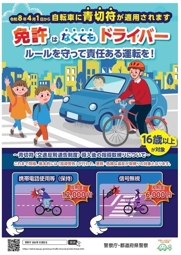 | ▲ 일본에서 올해 4월 새로 시행된 자전거 교통 범칙금 제도 도입을 안내하는 포스터. 새로운 제도에 따르면 자전거 운행 시 휴대전화 사용은 1만 2천 엔, 신호무시는 6천 엔의 범칙금이 부과된다. |