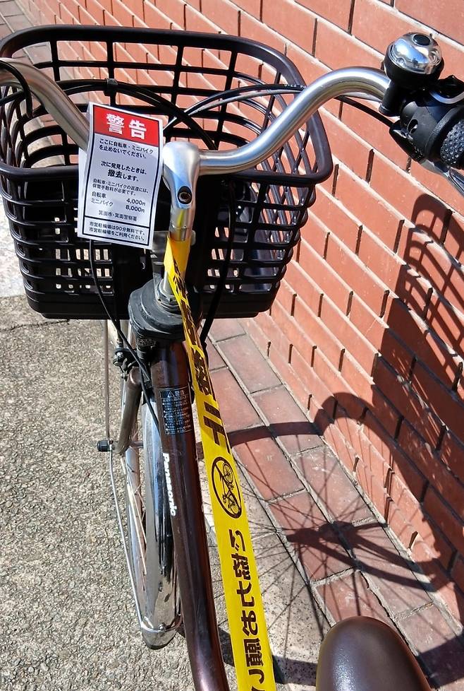 | ▲ 일본 오사카역 근처에서 자전거에 불법주차 경고문이 부착되어 있다. 오사카의 자전거 주차장은 대부분 유료이며 자전거를 무단으로 세웠다간 단속에 걸릴 수 있다. 단속에 적발되면 1차 경고, 2차 견인으로 수수료와 보관료 등을 물게 된다. |