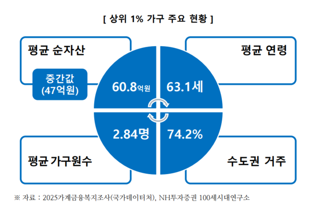 상위 1% 가구의 평균 순자산은 약 60억 원 수준이며, 중간값은 약 47억 원으로 나타났다. 이를 감안할 때 순자산 50~60억 원대는 현실적인 부자의 기준선으로 해석할 수 있다. 이들의 평균 연령은 63.1세로 비교적 높은 편인데, 이는 장기간의 경제활동과 꾸준한 자산관리의 결과로 풀이된다. 다시 말해 단기간의 고수익보다 장기적이고 안정적인 자산 축적이 부의 형성에 핵심적인 역할을 한다는 의미다.